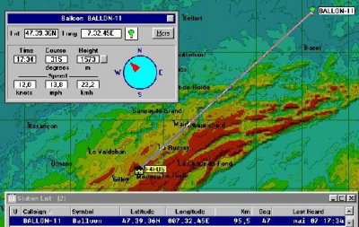 La station « automatique » du Haut Doubs a enregistré le log de la trajectoire du ballon. La dernière trame fut reçue à 17h34, alors que le ballon était à la distance de 95 km environ.