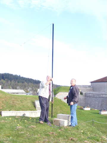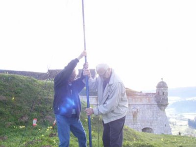 Pour ce faire le matin, en accord avec Martine, la directrice de la communauté de Commune du Larmont donc responsable du Fort de Joux, Jean-Claude F5HLQ, Georges F4EWJ, Marie F5UAY, montent les antennes Bazooka 40 et 20m au sein même du château, sur le sommet d’un promontoire couvrant une des casemates de type Mougin. Sous l’œil étonné du marquis de Vauban, nous bénéficierons ainsi, jusqu’au 13 mai, d’un abri, vers le pont-levis érigé sous Louis XIV.