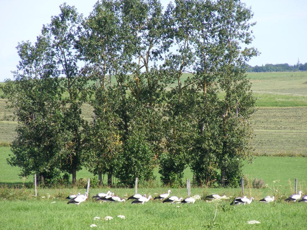 Ce matin, une centaine de cigognes se ravitaillent dans les champs entre Chaffois et Bulle à une dizaine de kilomètres de Pontarlier. Les jours sont comptés pour installer les aériens avant les premiers frimas !!!