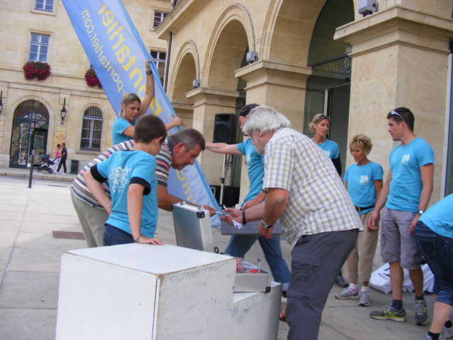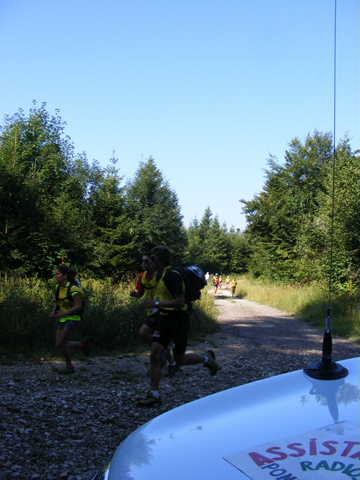 Le lendemain, autres épreuves jusqu’au retour place de la mairie à Pontarlier où tous les concurrents ont exécuté un flash mob devant les parents et amis venus nombreux les accueillir. En deux jours les 6 opérateurs ont assurés 27 postes. F4FUS accompagnait les secours, F4CQG, F5HLQ assuraient différents postes du parcours. F1SRX confiait le micro à Théo très expérimenté en assistance radio, Lucas et Julie qui se prennent au jeu de la radio secondaient Jeanjean et F5UAY. Les organisateurs eux-mêmes avaient souhaité disposer de matériel radio qu’ils ont largement utilisé pour modifier les emplacements de postes, connaitre la progression des coureurs, s’assurer de la présence des signaleurs. Les secours sont assurés par la sécurité civile qui dispose d’un quad pour les passages les plus inaccessibles. Les gendarmes en moto de cross, ainsi que « Pépé » secouriste, également en moto de cross, accompagnent les concurrents au cœur de l’épreuve.