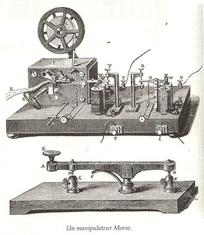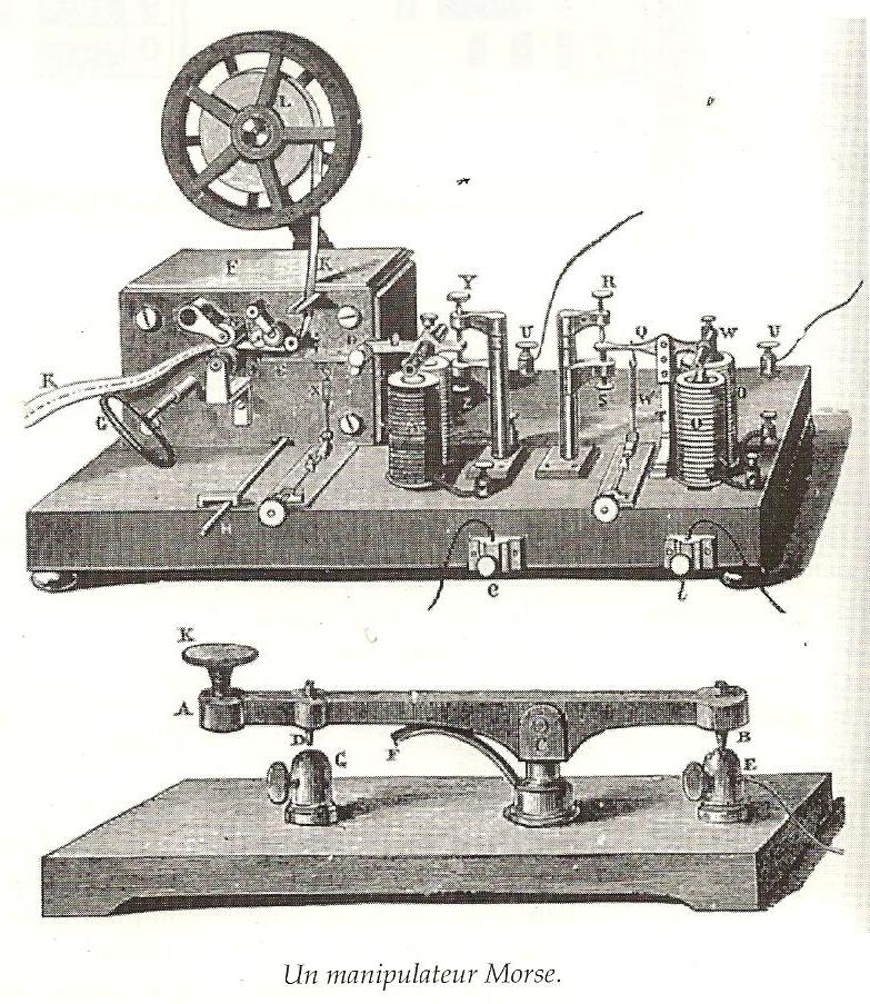 1835 : Samuel MORSE Va utiliser l’électro-aimant mis au point par Ampère et Arago. Il découvre que lorsque le courant passe dans l’aimant il attire le fer. Lorsque le courant ne passe plus, il ne l’attire plus. Si un fil relie deux points éloignés, on fait passer le courant pour envoyer un message. Il va crée son code télégraphique adapté au courant : marche, arrêt, marche arrêt. Pour former chaque lettre, il va combiner des points et des traits, les points sont des passages bref du courant, les traits des passages plus longs. A l’autre bout un récepteur comportant un électro-aimant est relié à un stylet