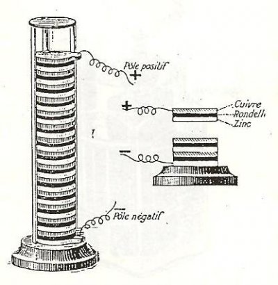 1799 : Alexandre VOLTA (1745-1827) construit la première pile électrique avec une rondelle de cuivre, une de zinc et une de tissu imbibé d’eau acidulée. La découverte de la pile eut, dans le domaine de l’électricité une portée considérable. Ainsi on put observer les effets du courant continu. C’est en particulier avec une batterie de piles que tous les grands savants réalisèrent leurs expériences d’électromagnétisme et d’induction qui devaient conduire à l’invention de dynamos, de moteurs, de transformateurs que notre monde moderne utilise en quantité.