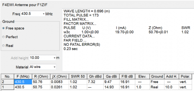 Le choix a été porté sur la réalisation de l’antenne à réflecteur multiple. Les résultats de la simulation de l’antenne dans un espace libre (monde virtuel) sont affiché sur la ligne numéro 2. La ligne numéro 1 affiche les résultats pour des condition d’utilisation dans un monde « réel » avec une antenne positionnée à 10m.