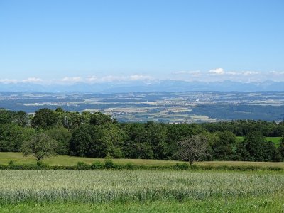 A Vallorbe la route est barrée direction Cossonnay, pour cause de travaux. Il faut prendre la direction du lac de Joux et descente sur Cossonnay en passant par le col du Mollendruz à 1200m . Magnifique vue sur les Alpes suisses et françaises, le mont Blanc, mais on n’est pas là pour le tourisme. On perd du temps et le ballon lui continue inexorablement sa descente à vive allure.