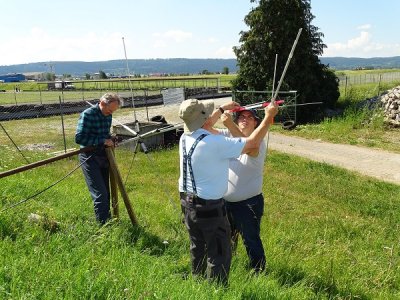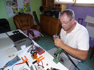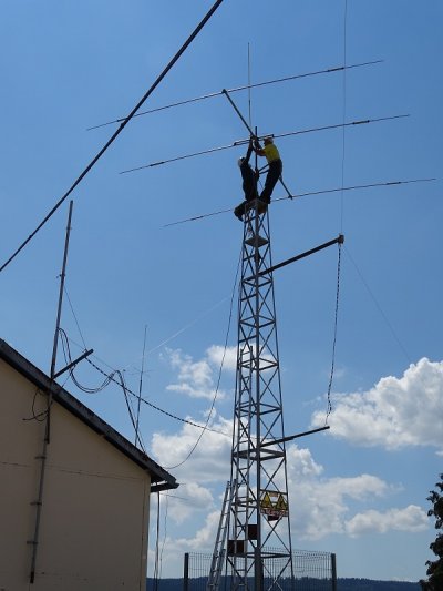 Depuis quelques temps, notre président Georges F4EWJ souhaitait que les experts fassent "un petit service" sur les antennes. Rendez-vous pris pour samedi 30 juin. F5HLQ Jean-Claude, grimpeur confirmé autant sur les arbres recueillant des ballons que sur les pylônes, fut le premier à lancer les hostilités, bientôt rejoint par Bernard F4FUS. Au sol, Thierry F4EWI était préposé aux soudures et au contrôle de ROS. Rapidement le coaxial de la fritzel fut remis à neuf, la tri bande réalignée.