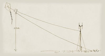 Un fil d’antenne était fixé à une extrémité du cerf-volant, l’autre extrémité étant mis à la terre. Faire voler le cerf-volant avec ce point d’ancrage supplémentaire et avec ces vents forts était une tâche difficile. Finalement, ils ont réussi à le faire tenir.