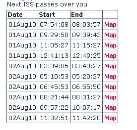 Sous la carte, un tableau vous donne les heures de passage en temps TU. Ajouter 1 (ou 2) heures pour avoir l’heure locale si vous êtes en hiver (ou en été)