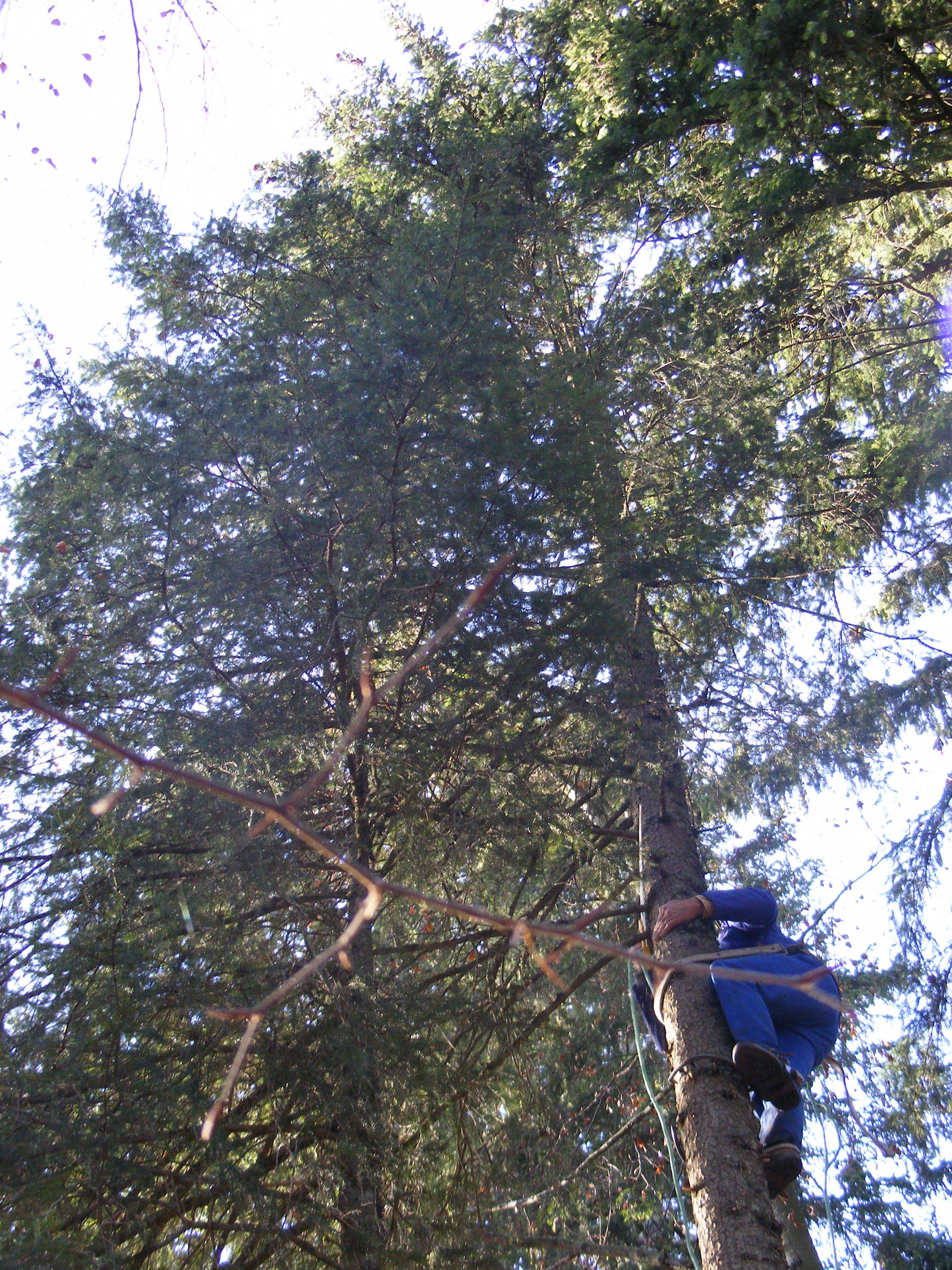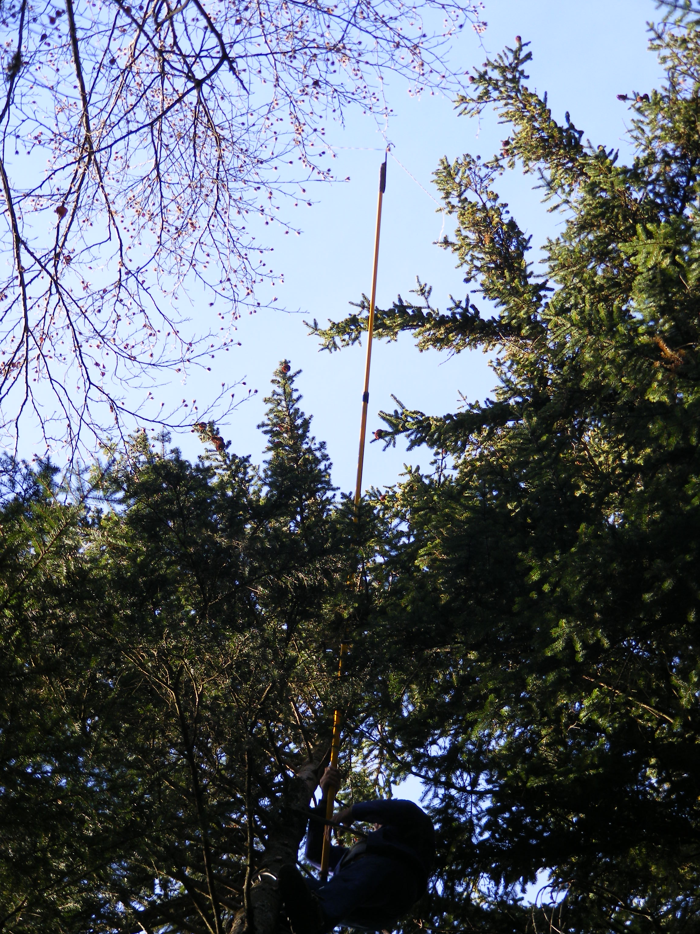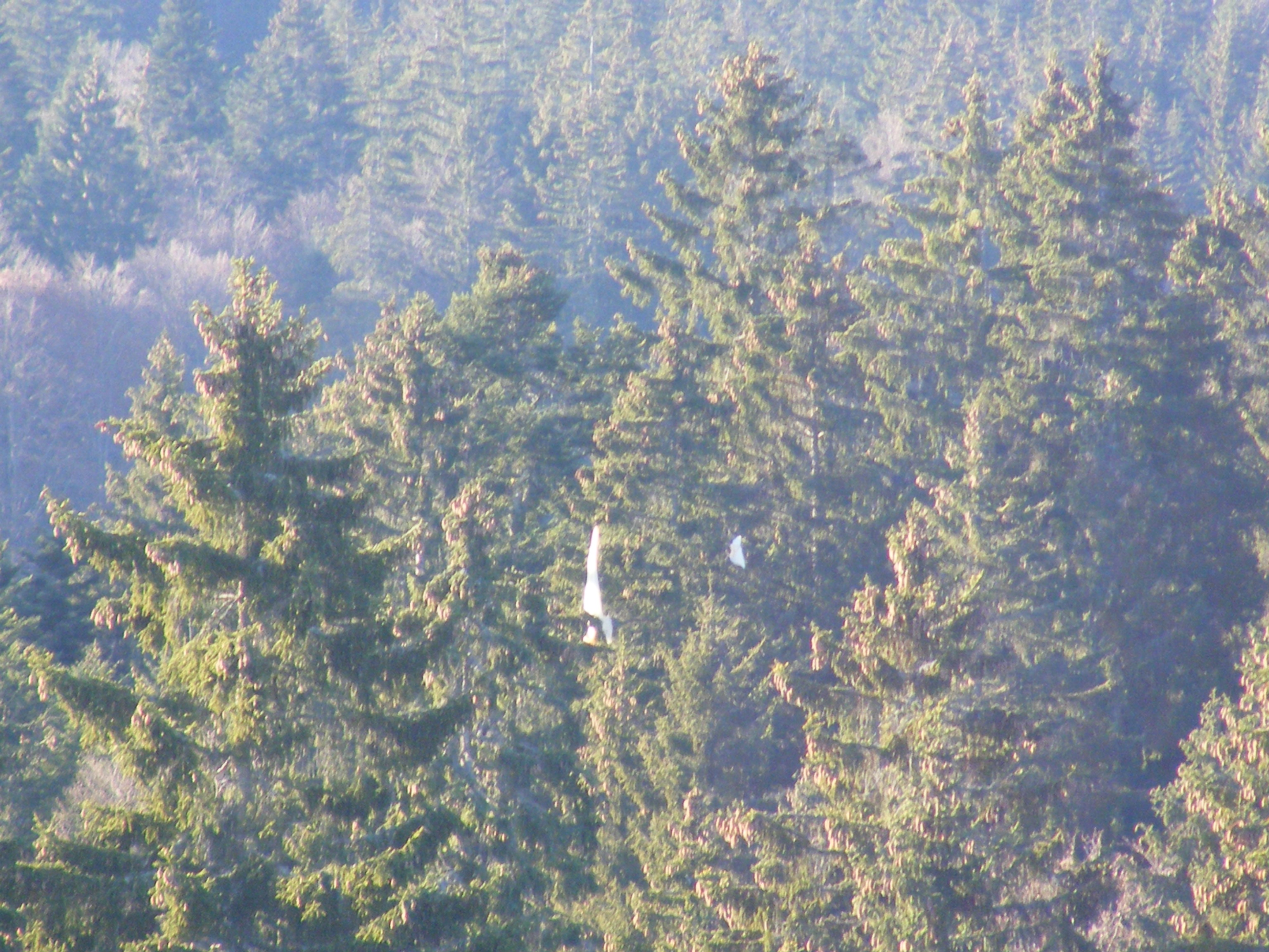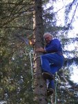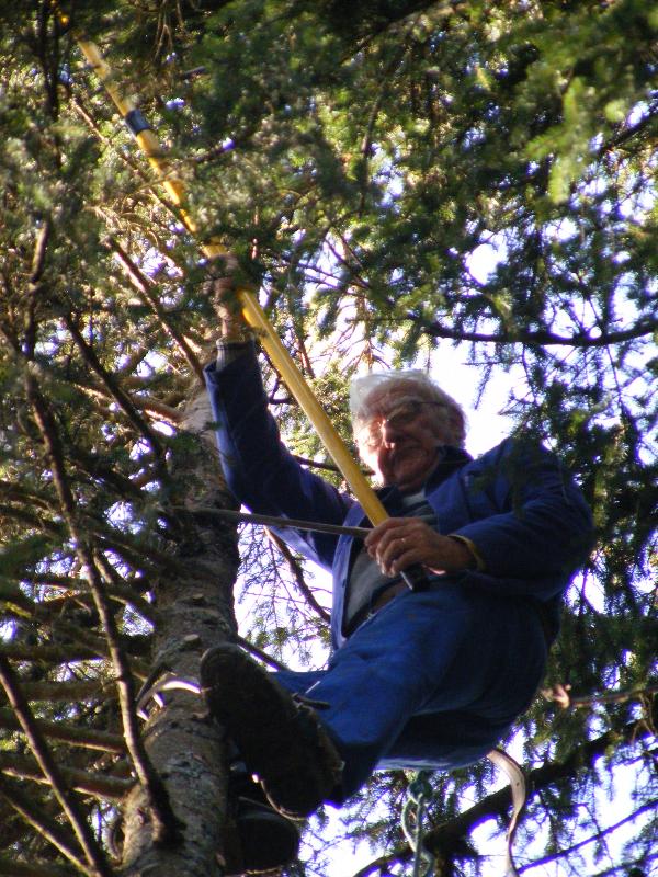 La semaine suivante, Jean-Claude ne s’avouant pas vaincu vient, équipé de tout un attirail qui lui permettra de monter à l’arbre pour essayer de les décrocher. Il monte à plus de 15 mètres, saisit le fil du parachute qui lui est suspendu à un sapin voisin, mais celui-ci se rompt. Nous ne pourrons récupérer ni l’un ni l’autre. L’important c’est que Jean-Claude prenne le moins de risques possible. Nous sommes retournés après la tempête mais les trois belles sont toujours fièrement accrochées dans les branches à environ 20 mètres de haut. Ah ces suissesses, elles aiment se faire désirer !