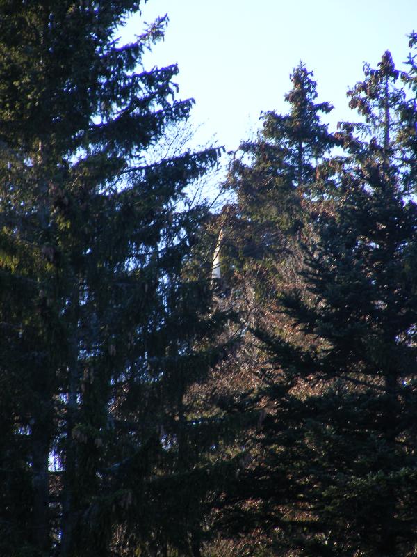Mardi 15 novembre, une alerte ballon sonde météo arrive dans notre boite mail : Une suissesse partie de Payerne devrait se poser aux Cernets à une douzaine de km de Pontarlier. Branle-bas de combat, c’est le début de l’après-midi, nous avons juste le temps de faire une petite virée de l’autre côté de la frontière pour essayer de trouver la belle. Nous nous engageons dans le secteur de recherche ciblé par F1SRX. Jeanjean « gognote » de son mieux, nous empruntons une petite route qui prend de la hauteur. Rien de ce côté, nous revenons sur nos pas en écarquillant les yeux, et là oh miracle, nous apercevons le parachute au sommet d’un sapin. L’approche pédestre nous mène au pied de l’immense sapin en haut duquel nous observons la sonde. Nous prenons des photos qui seront un précieux souvenir de notre 1er succès. Nous rentrons un peu déçus d’être bredouilles.