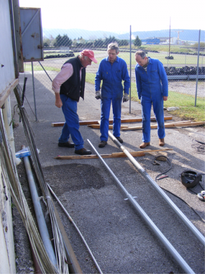 Mme Cairey Remonay F5MY à Morteau, nous propose de démonter leur pylône de 12 mètres qui ne sert plus depuis des années. De fabrication OM il est en excellent état. Situé sur un terrain en aplomb de la ville, nous devons faire appel à la DDE pour réussir à le démonter et le transporter jusqu’à Pontarlier. Les membres du club ont travaillé plusieurs week-end pour lui redonner un coup de jeune et le remettre en peinture. Nous devons le raccourcir à 10 mètres afin d’obtenir l’autorisation de la mairie de l’installer aux abords de notre local.
