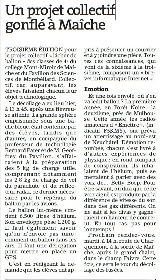 La trajectoire à été suivie par deux stations radio dont une installée au collège à MAICHE dans le DOUBS.
