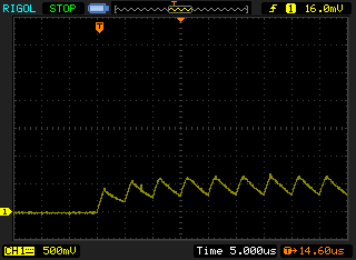 Là encore décevant, j’ai utilisé moins de valeurs, le signal est donc plus grossier mais la fréquence n’y est toujours pas : moins de 150Hz. Les sorties mettent encore trop de temps à changer leur rapport cyclique.