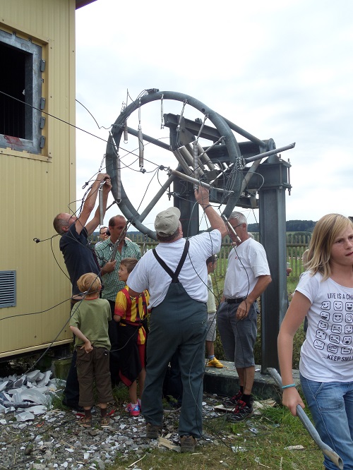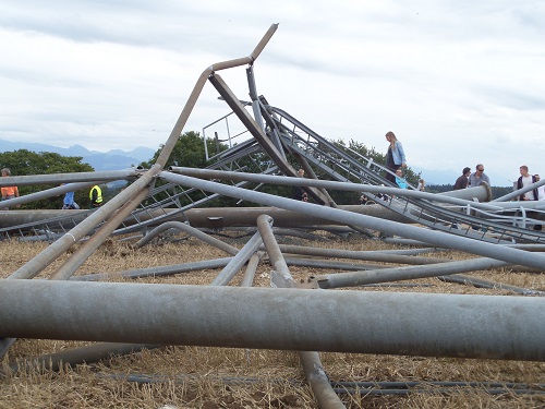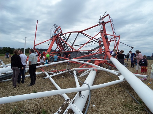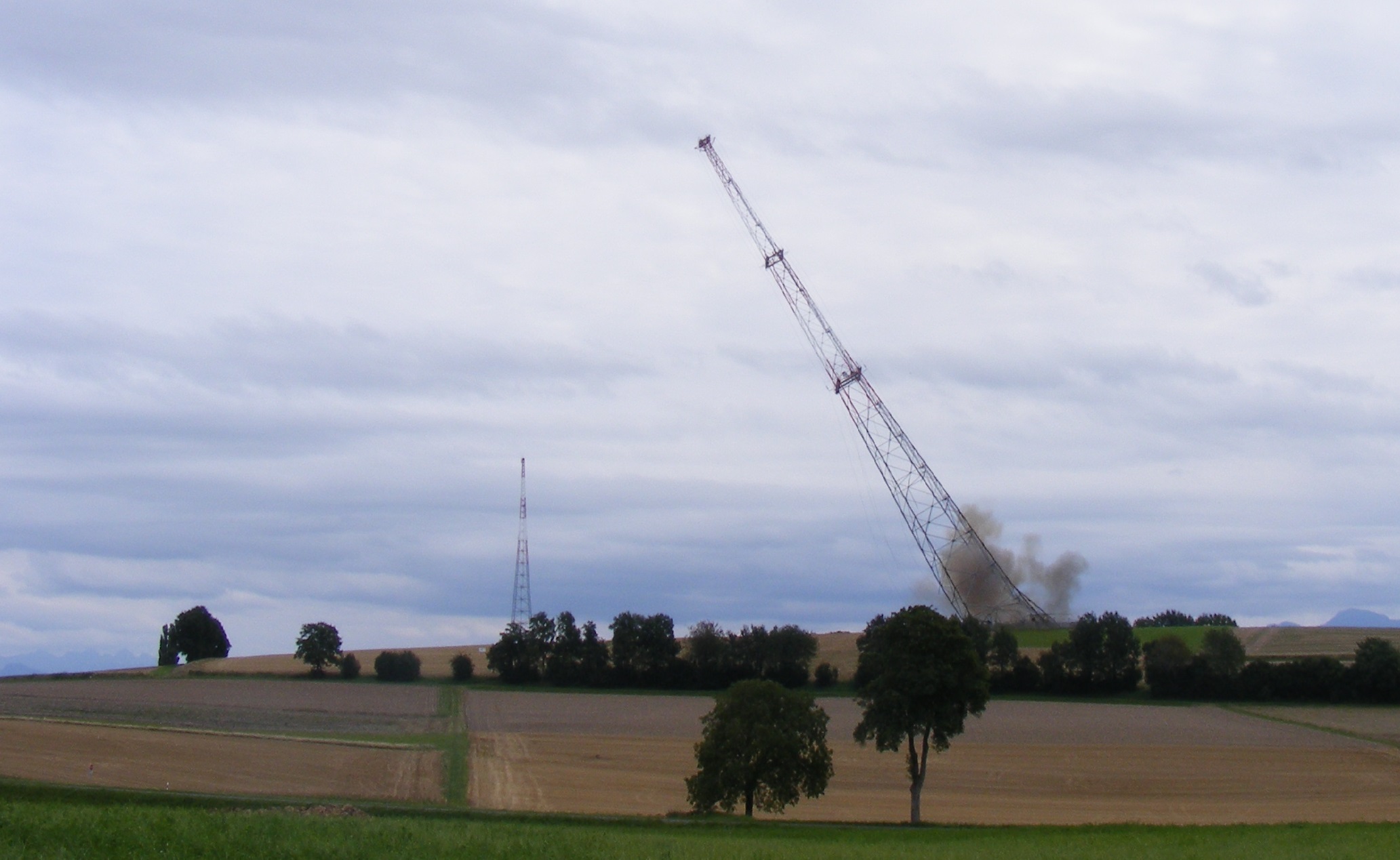 Le pylône de 188m en treillis d’acier, de 17m x17m à la base, a été dynamité ce mercredi 20 août 2014 à 14h03. Deux charges étaient placées sur les piliers sud et 4 charges sur les deux piliers Nord équipés de contre poids pour entrainer la chute du côté espéré. L’antenne s’est couchée lentement dans le champ en direction d’Yverdon. Près de 2.000 personnes se trouvaient sur le site pour assister à cet impressionnant dynamitage, qui s’est déroulé sans problème. Le public a pu ensuite se promener parmi les décombres du pylône. Chacun ayant à cœur de ramasser quelques boulons ou objets à garder en souvenir, les enfants en faisant un grand terrain de jeu. Tout sera aussitôt découpé en morceaux et le socle de béton démoli ainsi que la mise à la terre enlevée pour rendre le terrain parfaitement propre à l’agriculteur qui l’en sèmera dès cet automne.