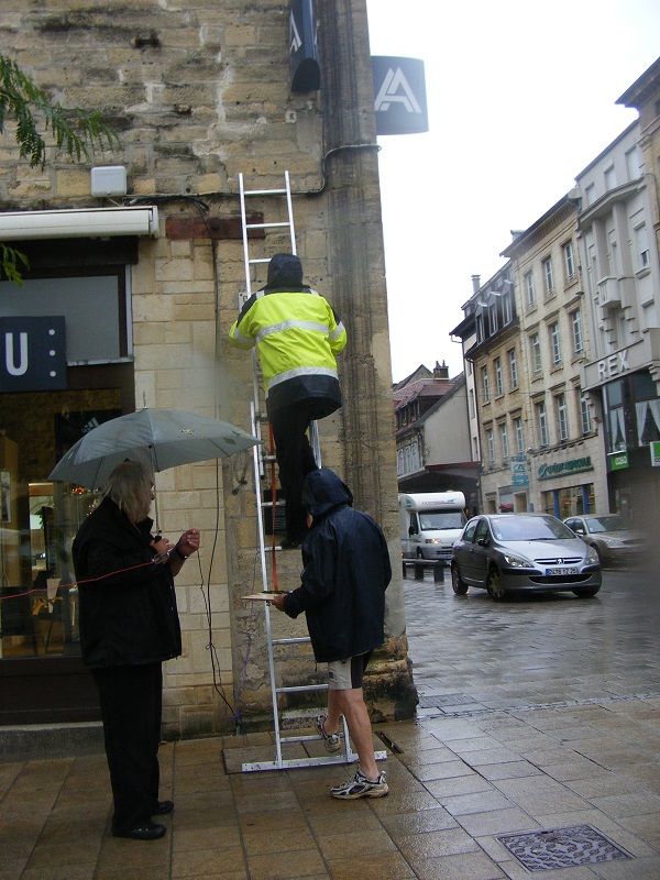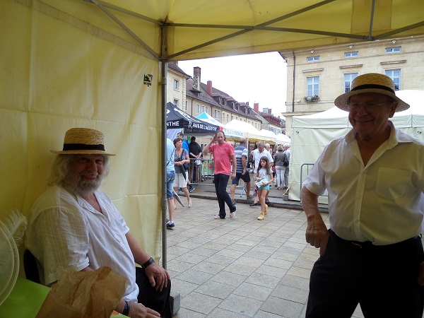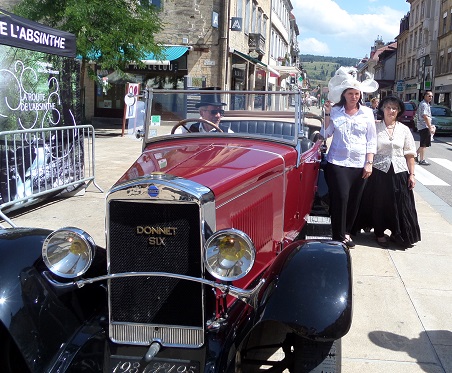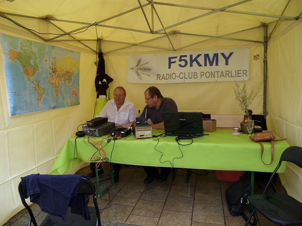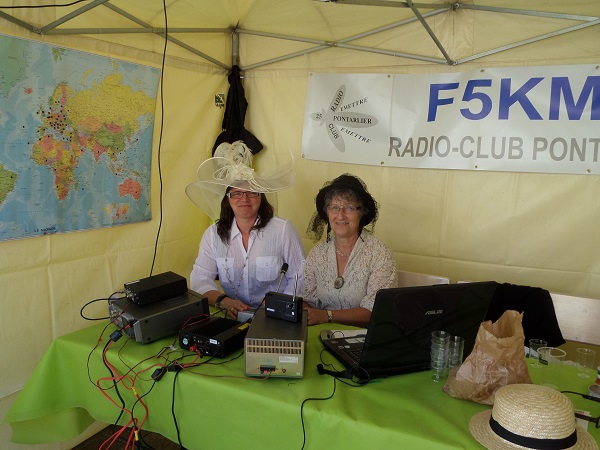Samedi 18 juillet : Il n’avait pas plu à Pontarlier depuis un mois, il a fallu qu’il fasse un gros orage très arrosé, au moment où nous installions l’antenne et le shake portable. Le soleil et un magnifique ciel bleu ont très vite refait leur apparition. Pour cette journée « Fête de l’absinthe » nous nous sommes pliés aux exigences de la mairie qui nous a demandé de porter les tenues spéciales rétro, fournissant même des canotiers aux Om présents.