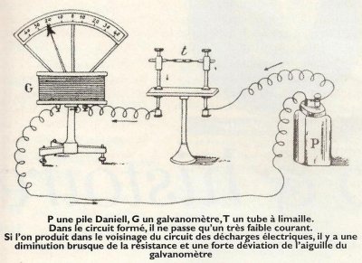 1890 : Edouard BRANLY (1844-1940) ce Français invente le cohéreur, tube rempli de limaille de fer, détecteur d’ondes électromagnétiques transformées en courant.