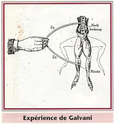 1786 : Luigi GALVANI physicien et médecin observe que les cuisses des grenouilles qu’il a mises sécher sur un fil de cuivre se contractent chaque fois qu’il touche le fer du balcon. Il s’en réfère à Volta qui prouve que c’est le contact de deux métaux et d’un corps humide qui provoque de l’électricité. Ainsi on découvrit l’électromusculation.
