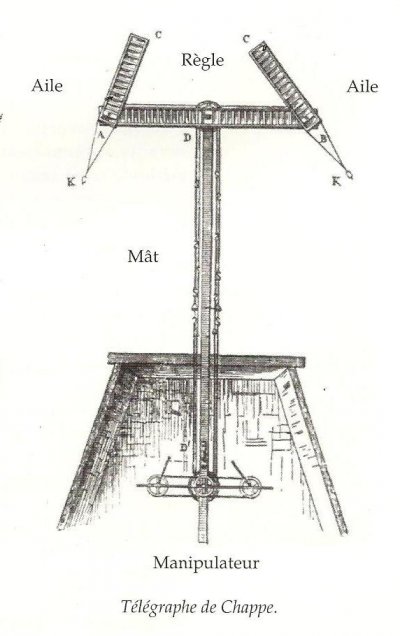 1793 : Claude CHAPPE met au point le télégraphe optique constitué de bras articulés établis sur des tours ou des clochers permettant d’envoyer des messages pendant les guerres de la Révolution.