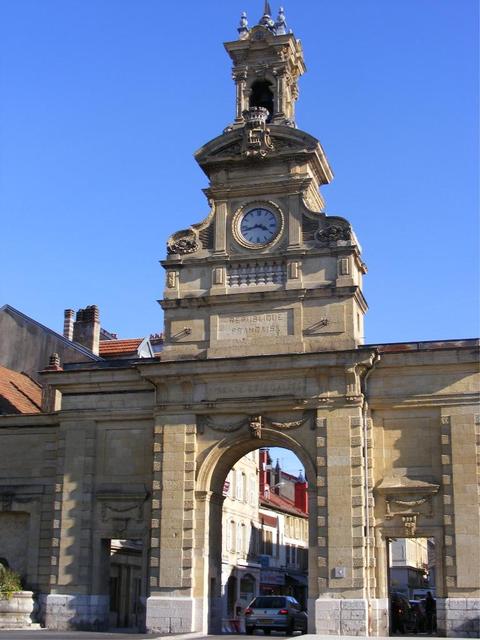 Porte Saint Pierre : Classée à l’Inventaire supplémentaire des monuments historiques ; elle est devenue l’élément incontournable de l’image de Pontarlier. L’ancienne porte du boulevard ayant été endommagée par les incendies fut remplacée dès 1768 qui correspond à la partie inférieure de la porte, construite, dit-on sur le modèle de la porte Saint Martin à Paris, ressemblait plus à un arc de triomphe. A la demande des Pontissaliens il y fut ajouté les deux fontaines qui bordent les passages latéraux. Et le campanile supportant l’horloge et une cloche. D’abord en bois recouvert de zinc il sera reconstruit en 1898 avec une horloge à sonnerie avec cadrans lumineux. |