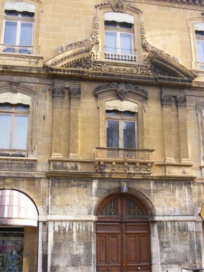 Il faut lever la tête en se baladant dans la rue de la République. Des fenêtres sont habillées de bois avec des formes variées. De très belles ferronneries ornent les balcons. |