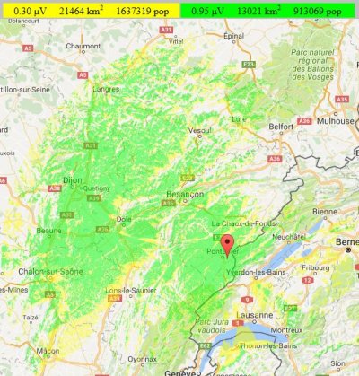 Voici la simulation de couverture théorique du relais, réalisée grâce au site RadioMobile de VE2DBE.