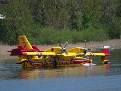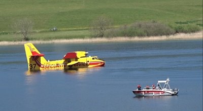 Ce lundi matin, un bombardier d’eau type Canadair, était en exercice au-dessus du Lac Saint Point pour s’assurer de la possibilité d’intervention en cas d’incendie de forêt. Le lac qui a une longueur supérieure à 7km est homologué comme zone d’écopage qui doit être au minimum de 2 kms. L’accès au bord de l’eau était interdite à tout loisir. Un zodiac de la gendarmerie effectuait des allers et retours pour assurer la sécurité des curieux. Celle du pilote était confiée aux bons soins des sapeurs pompiers sur leurs deux bateaux.