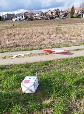 L’éclatement du ballon à 23,600m se situait à proximité du lac de Neuchâtel (CH). Il a chuté assez rapidement pour touché le sol vers Laupen à l’est de Morat (CH). Décodé quasiment jusqu’au sol, à 498m d’altitude, il a été rapidement retrouvé, en bordure d’une route, par les deux équipes en 46°55. 59 N 7°13.51 E, en JN36OW. Félicitations à eux.