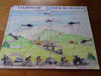 Nous avions préparé un tableau expliquant les liaisons HF Tour De France dont nous suivi une arrivée à Pontarlier, avec photos d’appareils de transmissions, antennes, etc...