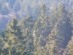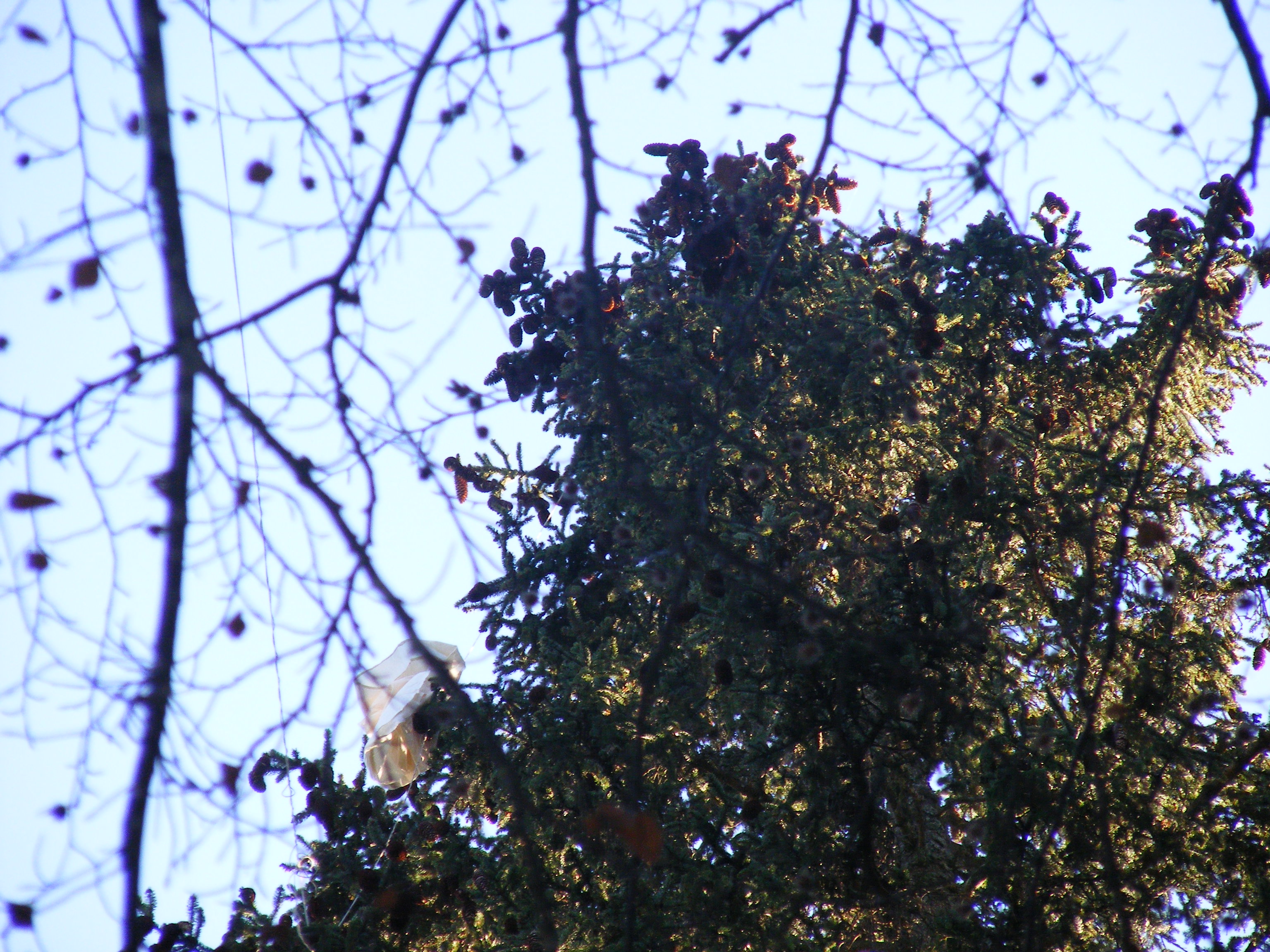 Mardi 15 novembre, une alerte ballon sonde météo arrive dans notre boite mail : Une suissesse partie de Payerne devrait se poser aux Cernets à une douzaine de km de Pontarlier. Branle-bas de combat, c’est le début de l’après-midi, nous avons juste le temps de faire une petite virée de l’autre côté de la frontière pour essayer de trouver la belle. Nous nous engageons dans le secteur de recherche ciblé par F1SRX. Jeanjean « gognote » de son mieux, nous empruntons une petite route qui prend de la hauteur. Rien de ce côté, nous revenons sur nos pas en écarquillant les yeux, et là oh miracle, nous apercevons le parachute au sommet d’un sapin. L’approche pédestre nous mène au pied de l’immense sapin en haut duquel nous observons la sonde. Nous prenons des photos qui seront un précieux souvenir de notre 1er succès. Nous rentrons un peu déçus d’être bredouilles.