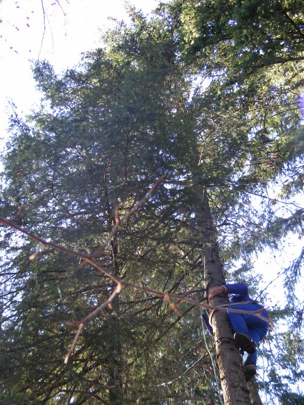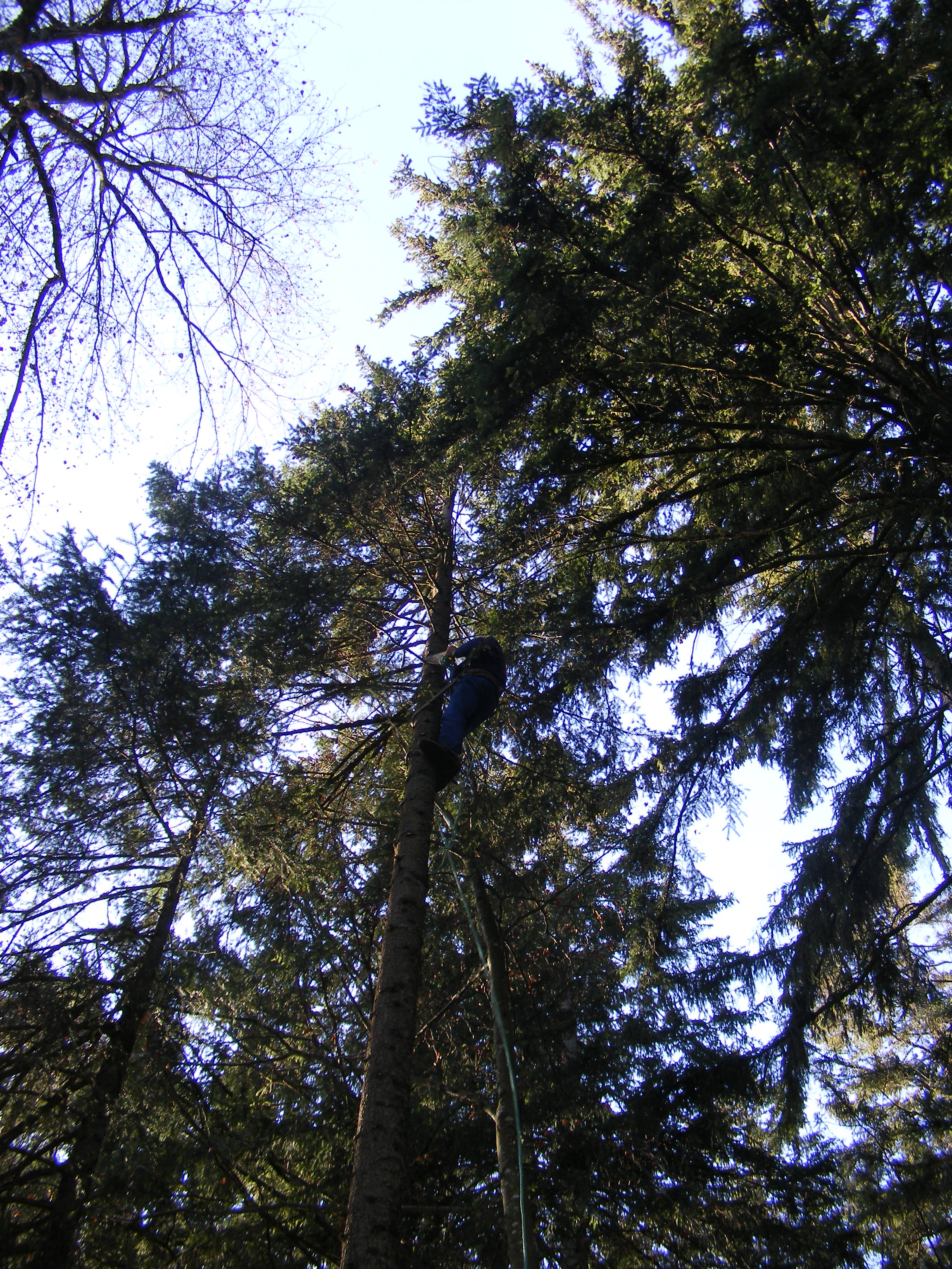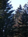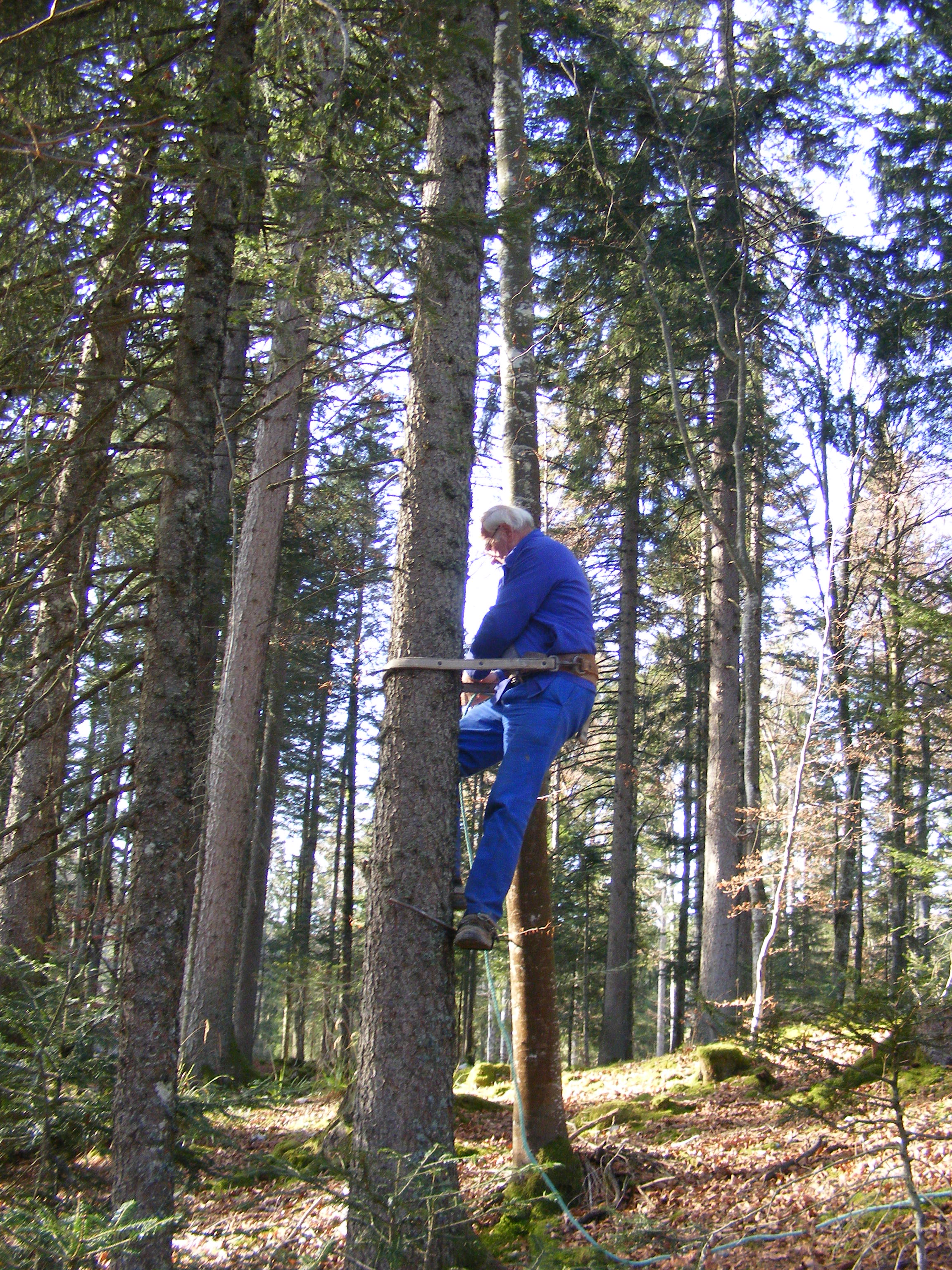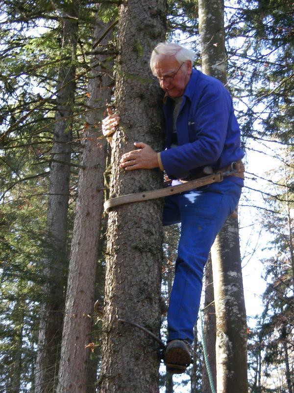 La semaine suivante, Jean-Claude ne s’avouant pas vaincu vient, équipé de tout un attirail qui lui permettra de monter à l’arbre pour essayer de les décrocher. Il monte à plus de 15 mètres, saisit le fil du parachute qui lui est suspendu à un sapin voisin, mais celui-ci se rompt. Nous ne pourrons récupérer ni l’un ni l’autre. L’important c’est que Jean-Claude prenne le moins de risques possible. Nous sommes retournés après la tempête mais les trois belles sont toujours fièrement accrochées dans les branches à environ 20 mètres de haut. Ah ces suissesses, elles aiment se faire désirer !