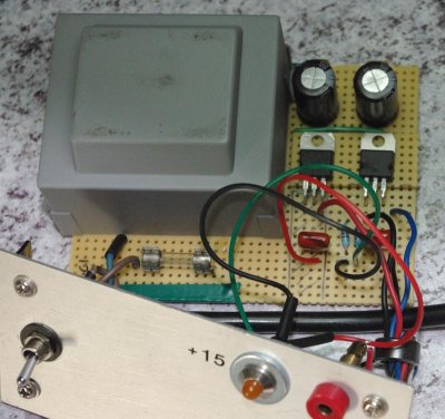 Je vous laisse découvrir les photos, il n’y a aucune difficulté technique et le schéma est simplement celui fourni dans les datasheets des régulateurs 7815 et 7915.