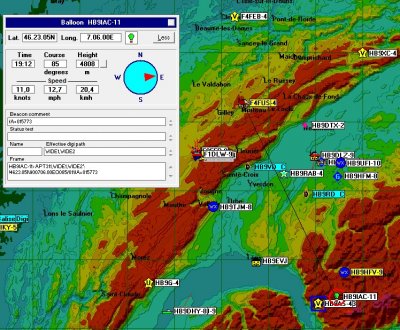 Depuis un point haut, à 1160 m, il n’a pas été difficile de suivre la trajectoire sachant qu’un émetteur et un GPS étaient embarqués. Le réseau radioamateur APRS a fait le travail : 144,800 MHz.