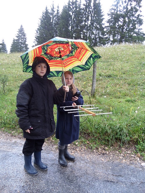 Ni les averses incessantes, ni la température de 9° ne les ont rebutés. Armés de l’antenne directive et du Yupitéru qu’ils font dévier en fréquence chacun leur tour, ils ont cherché aux environs du Chalet « Beurre » pour découvrir leur trésor au pied d’un petit sapin dans un champ après un QSY sur la fréquence harmonique de 807mhz.