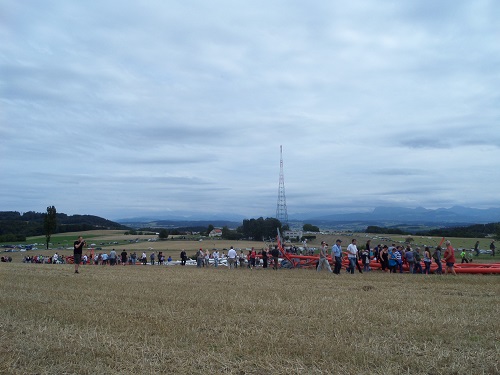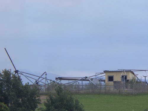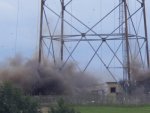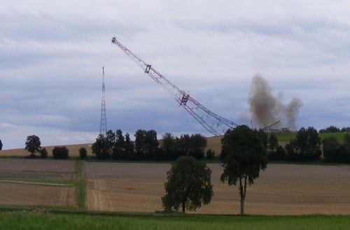 Le pylône de 188m en treillis d’acier, de 17m x17m à la base, a été dynamité ce mercredi 20 août 2014 à 14h03. Deux charges étaient placées sur les piliers sud et 4 charges sur les deux piliers Nord équipés de contre poids pour entrainer la chute du côté espéré. L’antenne s’est couchée lentement dans le champ en direction d’Yverdon. Près de 2.000 personnes se trouvaient sur le site pour assister à cet impressionnant dynamitage, qui s’est déroulé sans problème. Le public a pu ensuite se promener parmi les décombres du pylône. Chacun ayant à cœur de ramasser quelques boulons ou objets à garder en souvenir, les enfants en faisant un grand terrain de jeu. Tout sera aussitôt découpé en morceaux et le socle de béton démoli ainsi que la mise à la terre enlevée pour rendre le terrain parfaitement propre à l’agriculteur qui l’en sèmera dès cet automne.