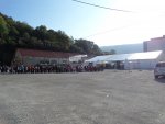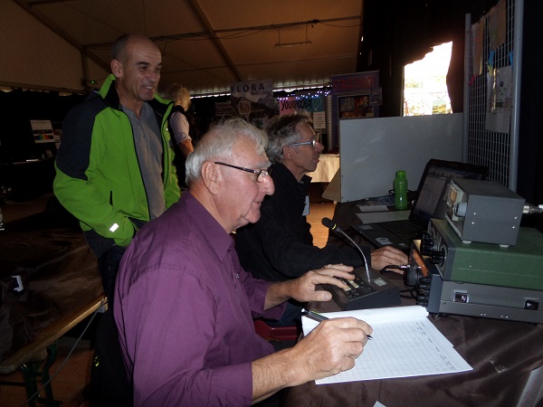 Notre antenne était une levy que les employés de la ville avaient accrochée, avec leur nacelle, à 5 ou 6 m du sol après un lampadaire, puis à une extrémité sous le toit d’un bâtiment désaffecté. L’autre extrémité fut fixée après le vitabri dans lequel nous étions hébergés. Notre TX est toujours le TS570D avec ses 100W et le micro MC 85 dont nous avions réduit la compression au maximum sur les conseils de nos correspondants. Les installations en portable au milieu des manifestations ne sont jamais évidentes, environ 200 enfants étaient en permanence dans notre environnement, autant dire que les piaillements fusaient.