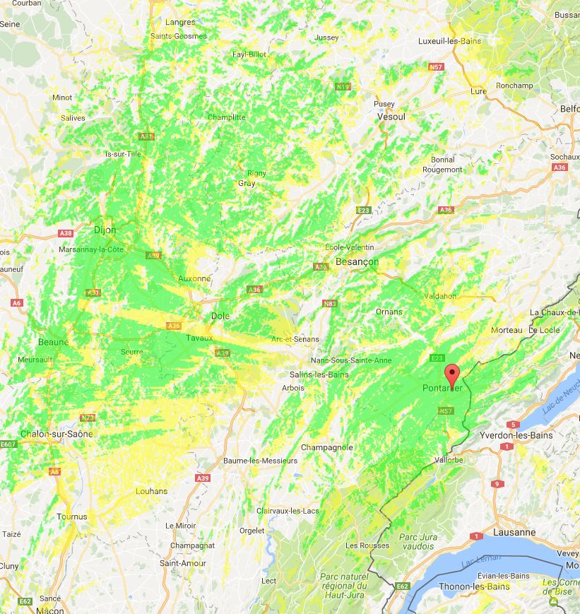 Voici la simulation de couverture théorique du relais, réalisée grâce au site RadioMobile de VE2DBE.
